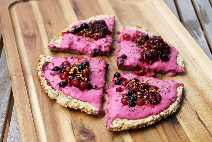 Den Teig aus dem Ofen nehmen und abkühlen lassen. Joghurt darauf verteilen und die Beeren darüber geben. Evtl. noch mit Chia-Samen und Blütenpollen garnieren und servieren.