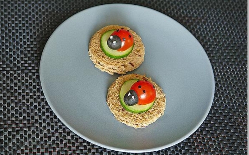 Mit Frischkäse je 2 Augen auf die Marienkäfer-Köpfe tupfen.